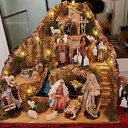 Eine farbenfrohe Keramikkrippe aus Südafrika mit einer charakteristischen dunklen Glasur gehört in die Sammlung der Krippen außereuropäischer Kontinente. Die weiteren Darstellungen, wie z.B. eine Weihnachtskrippenlandschaft im Neapolitanischen Stil mit Bachlauf aus Baumrinde und eine norddeutsche Weihnachtskrippe in weißem Porzellan, geschaffen 2022 werden mit weiteren Krippen bei der Krippenwanderung zu sehen sein.