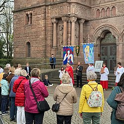 Die große Palmsonntagsprozession wird danach von Fahnen und dem geschmückten Kreuz angeführt und geht über die Dorotheenstraße zur Marienkirche. Nach dem festlichen Einzug feiern die Christen dort die Eucharistie zur Eröffnung der Karwoche. Buchsbaumzweige sind vorbereitet. Gerne können aber auch selbst gestaltete Buchsbaumsträuße mitgebracht werden.